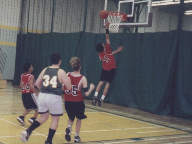 Nigel makes a layup, with Christian (left) and Dave (right) looking on