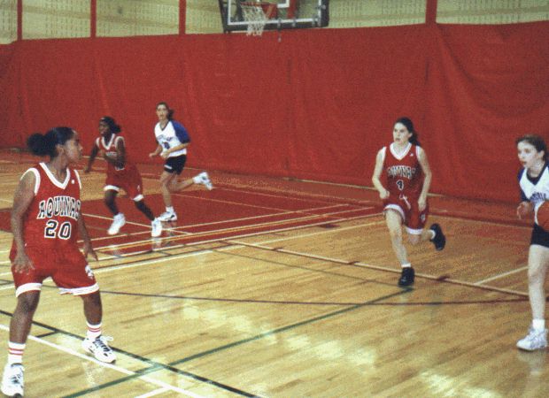 Simone in defensive position (left), with Meghan running back (right) and Stephanie hustling back