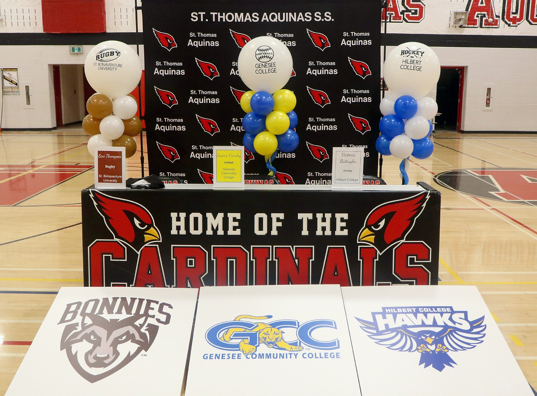 The St. Thomas Aquinas community celebrated three athletes in a ceremony where they signed their intent to play in their respective sports at the university and