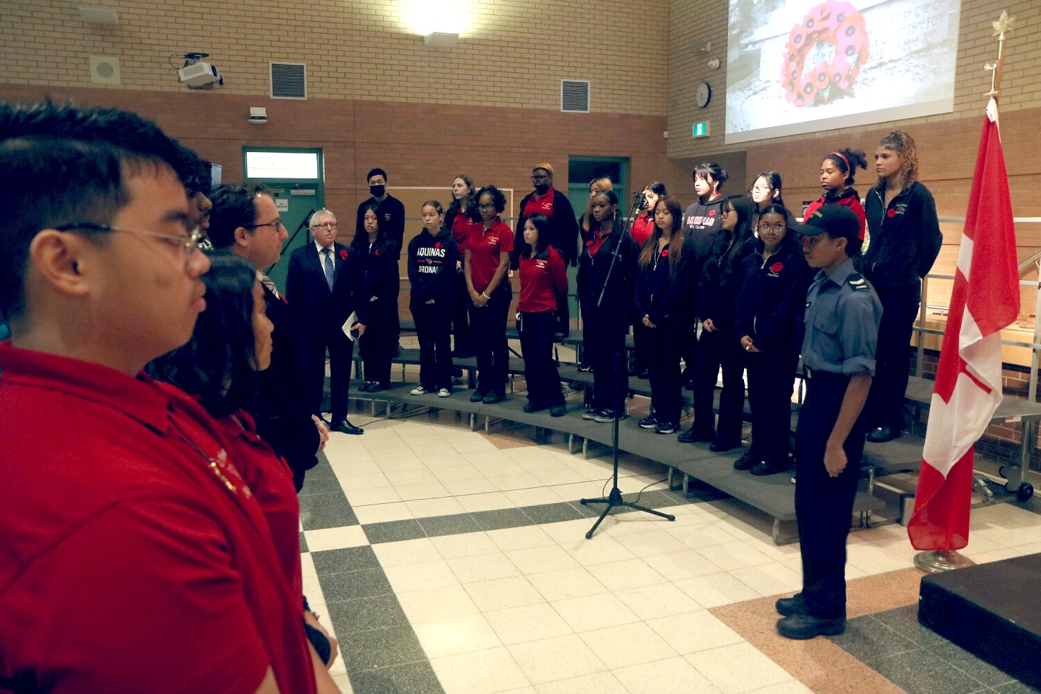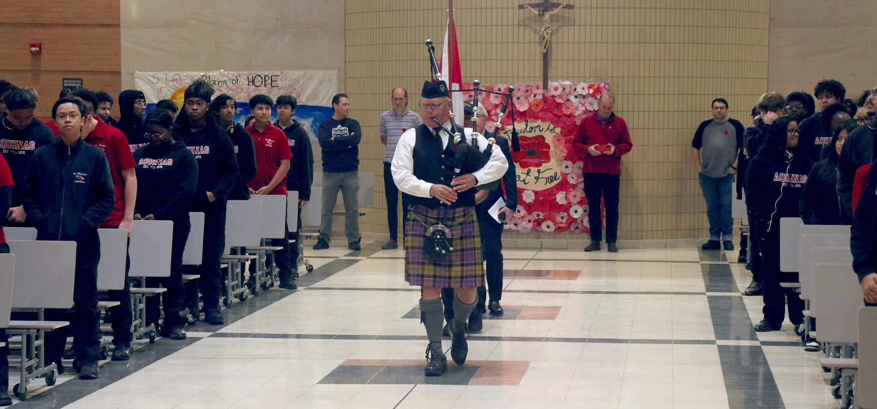 The St. Thomas Aquinas observed Remembrance Day, starting with a bagpipes procession, then music from the band, remarks from veteran Corporal O'Keefe, a dance by the RAP Grade 9's,