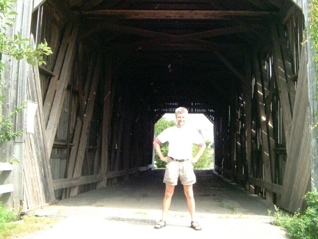 Dr. J in front of the Salmon River covered bridge near Sussex