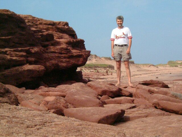 Dr. J on the red-coloured rocks which Prince Edward Island is famous for