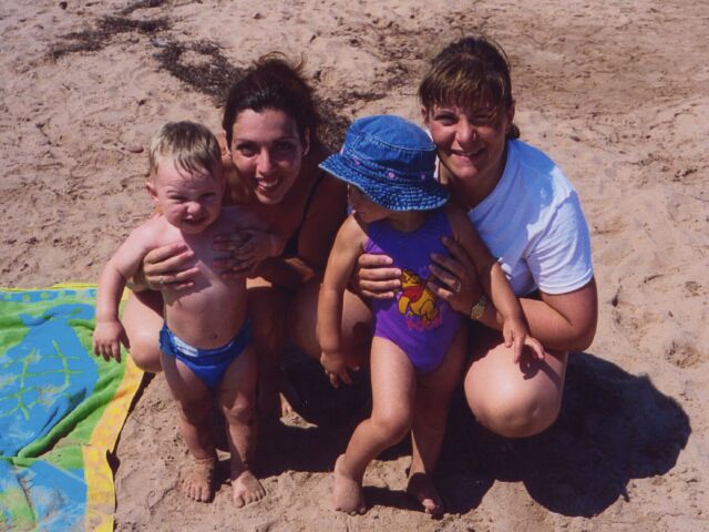 Ex-Aquinas scholars Lisa and Helena on the beach each with their eldest child