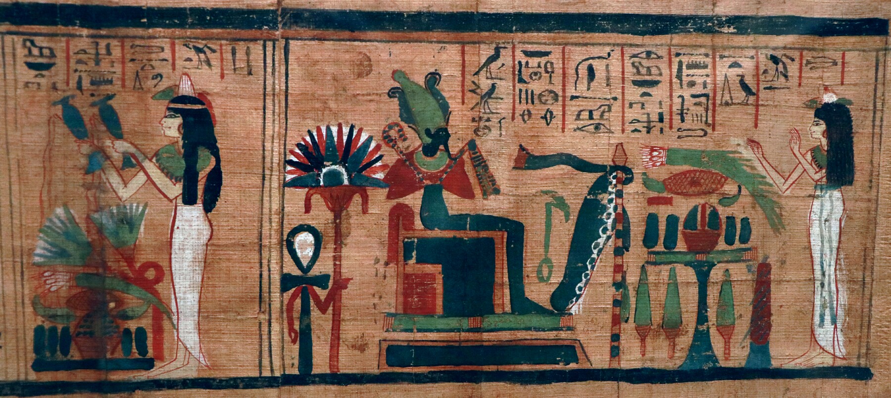 Above: Ancient Papyrus scrolls, with a Pharaoh and his wife, and lots of ancient symbol, such as the Ankh, cross shape but with a teardrop-shaped