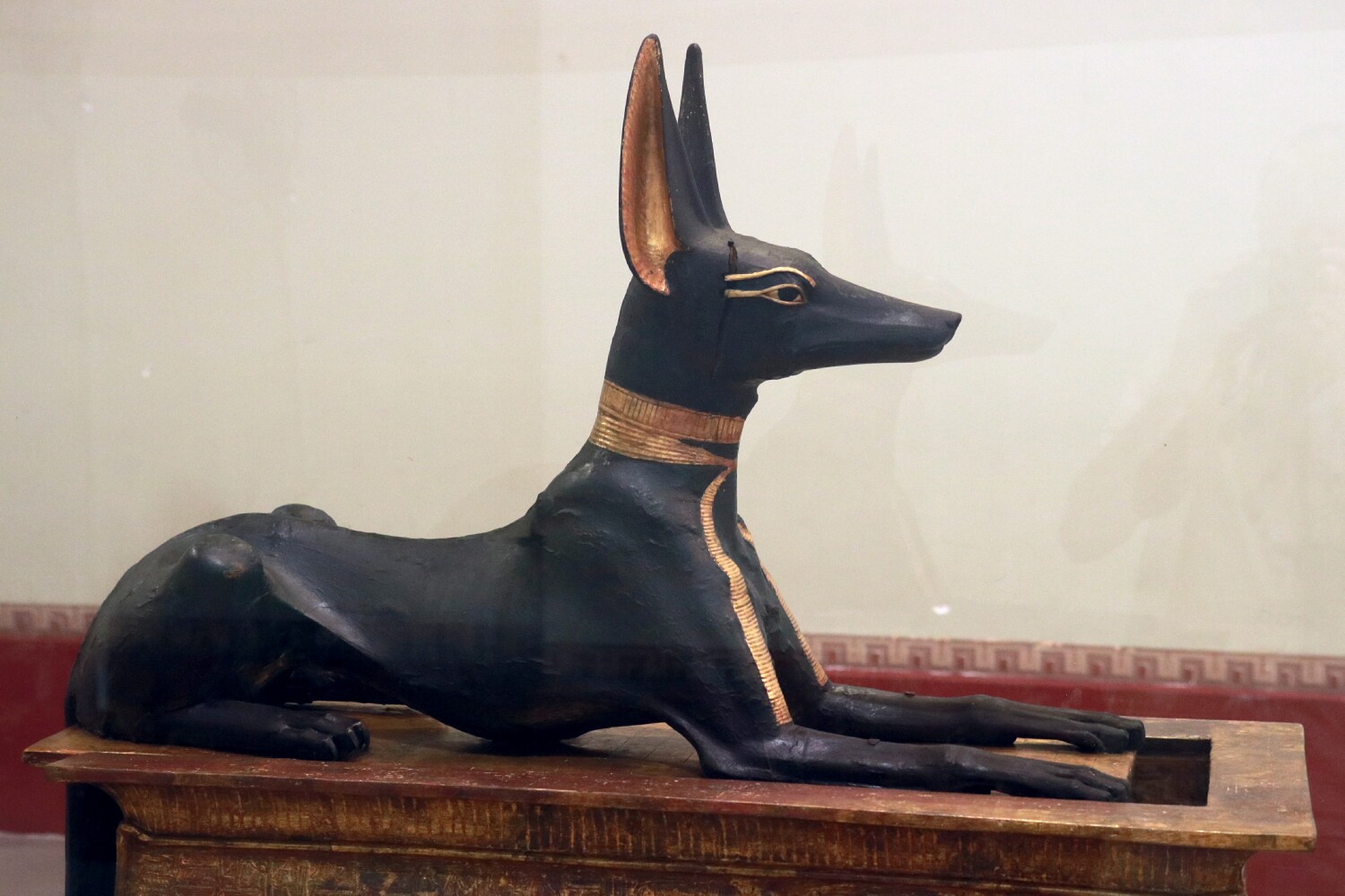 1 is the Anubis Shrine, made of wood with black and gold paint, part of the burial equipment of the Pharaoh Tutankhamun.