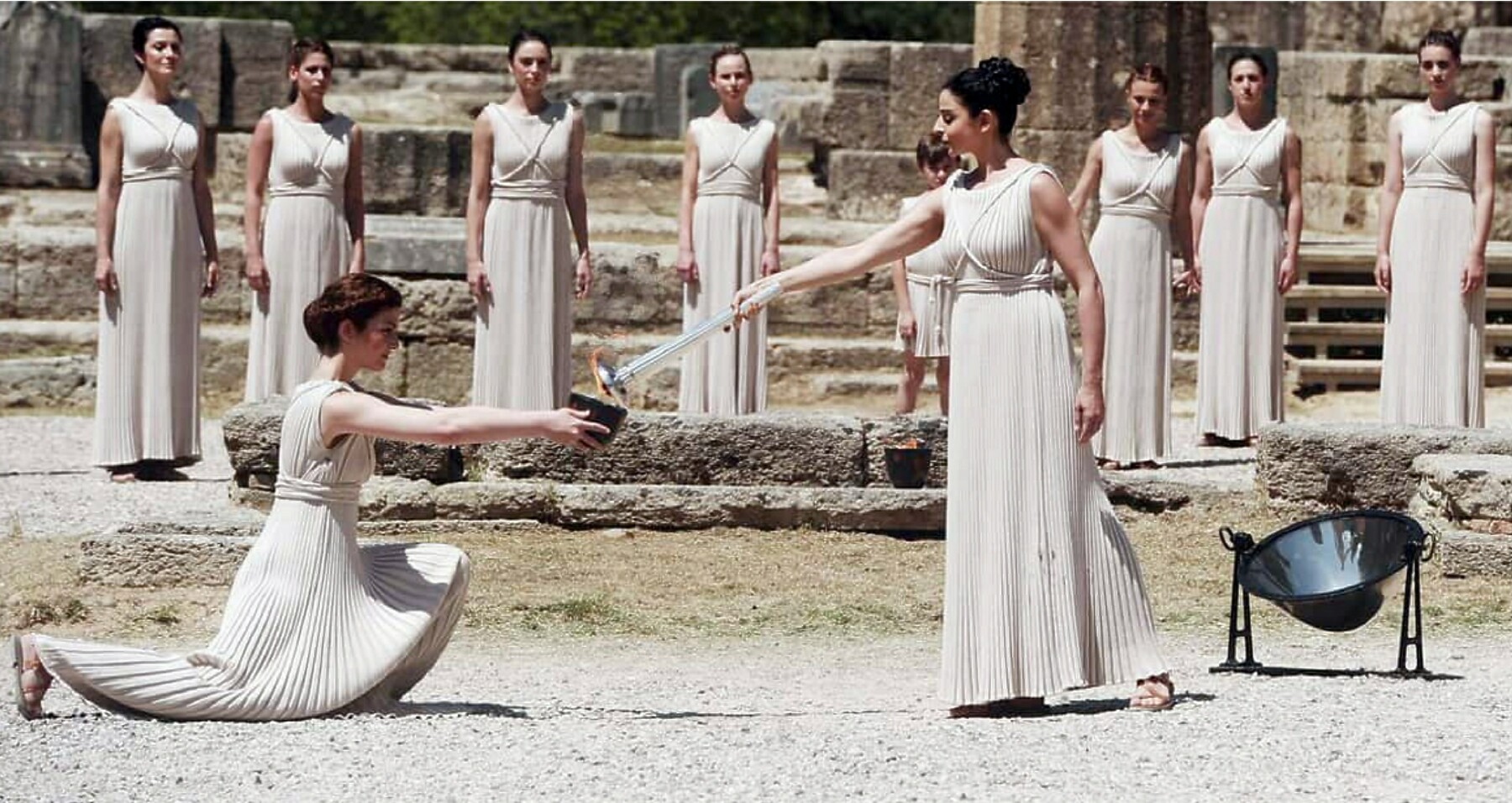 Above: Every Olympics, a group of actresses in 2012 re-enact the original Olympic ceremony where a high priestess invoking Apollo and lighs the flame using the sun.