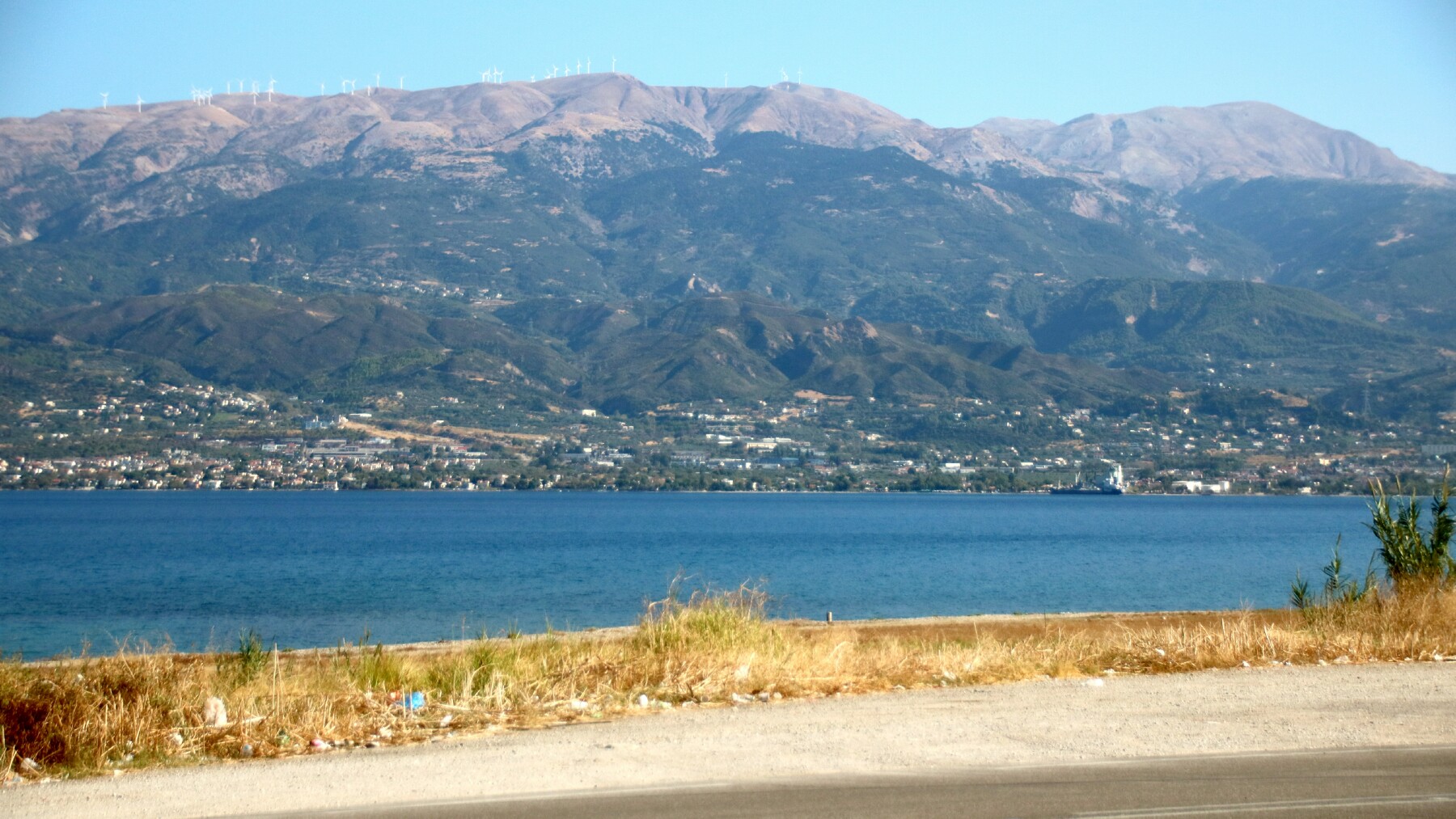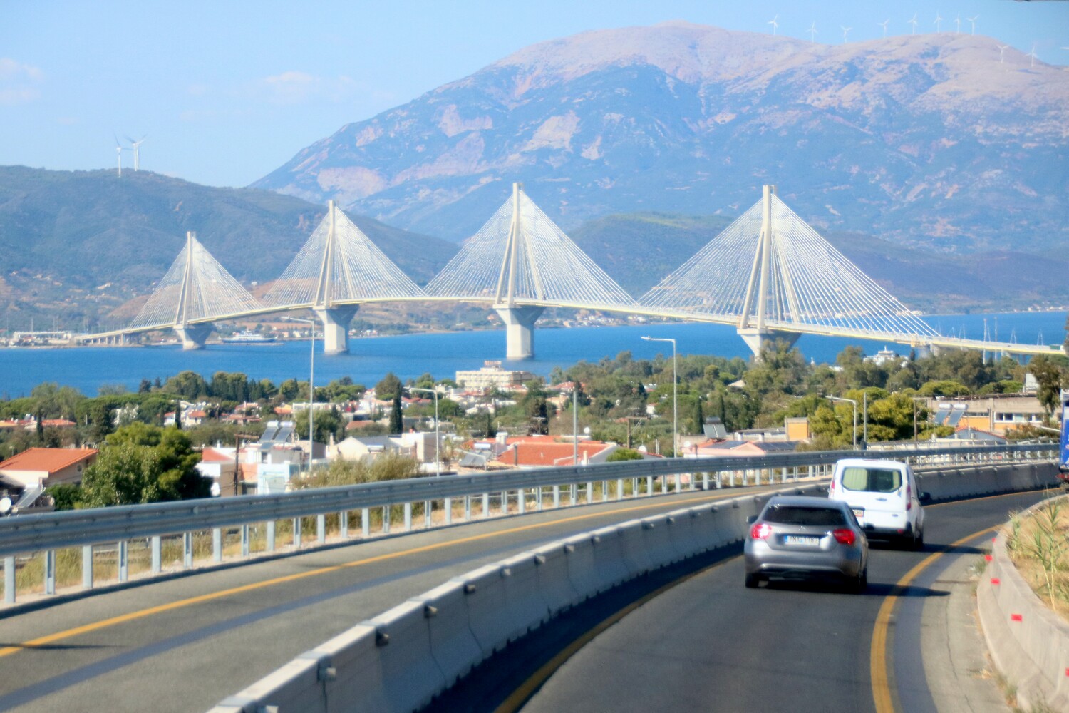 Above: View from the highway of the Gulf of Patras, driving towards the city of Patras and the Charilaos Trikoupis Rio-Antirrio Bridge.