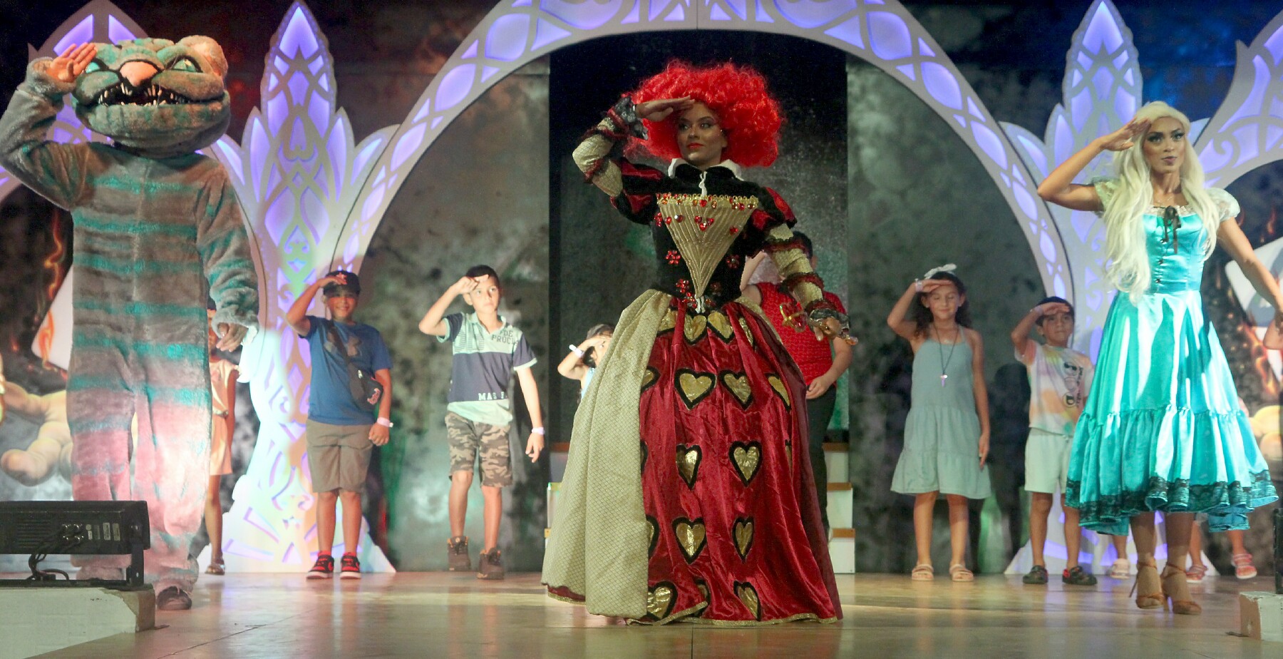 Above: The Red Queen of Hearts with Alice and the Cheshire Cat, and youngsters from the audience.