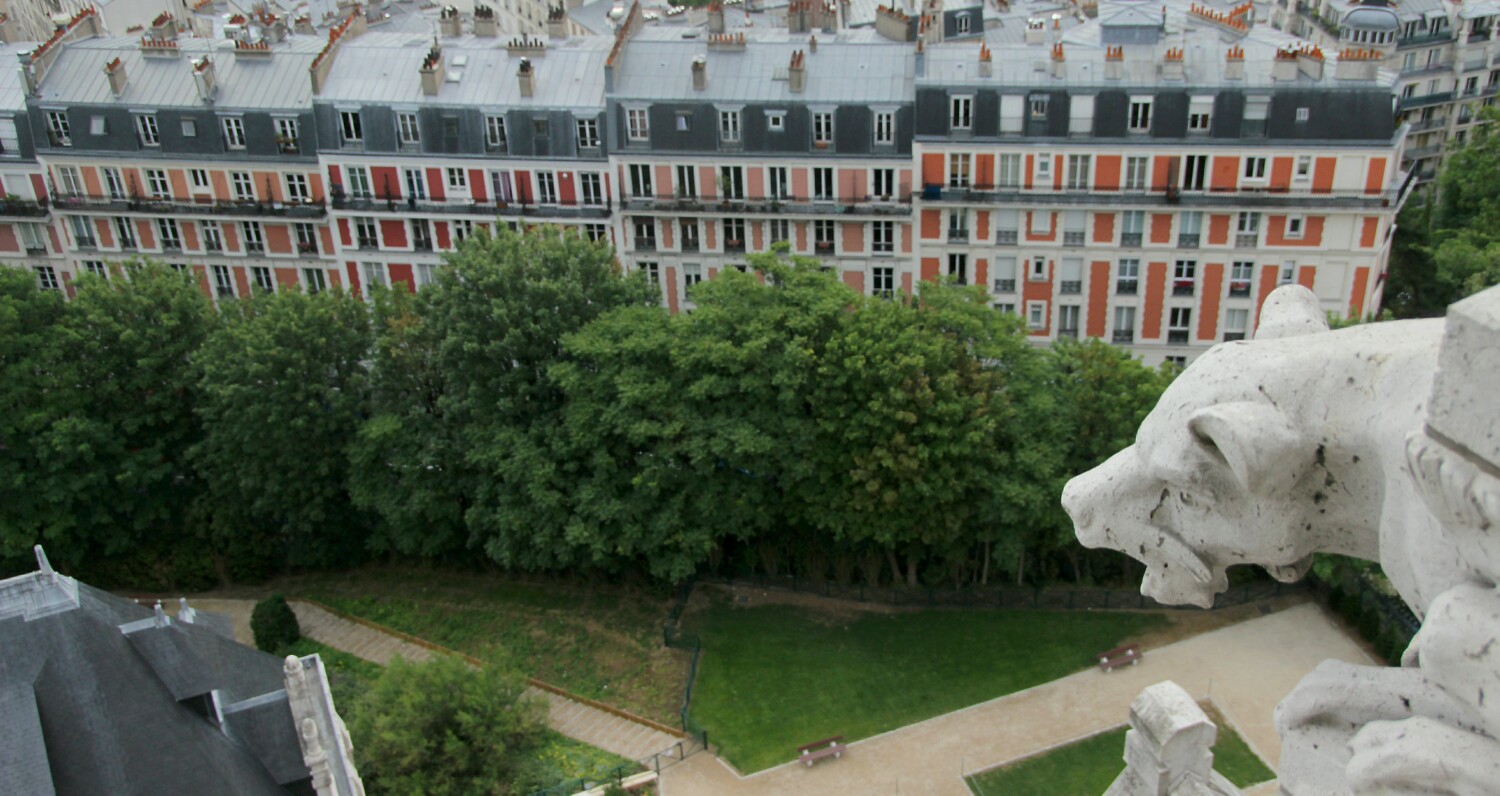 Above: The southern view from the Sacré-Cœur Basilica dome of a gargoyle and the grounds below.