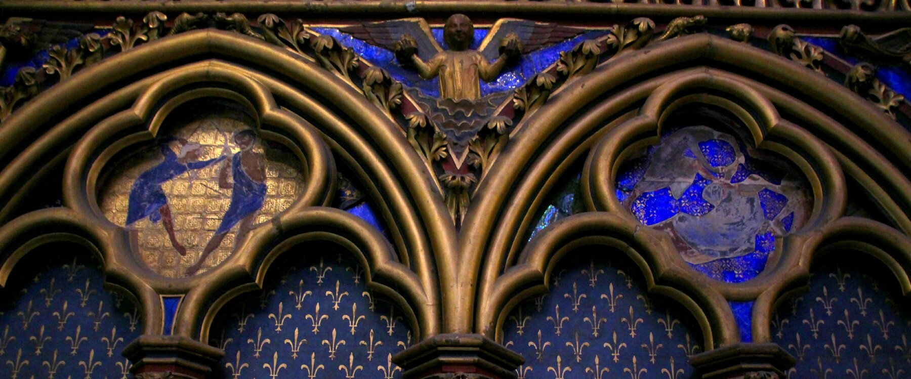 Above: Wall detail in the main upper chapel of Sainte-Chapelle, the church built by Louis IX by 1248 built primarily of stained glass.