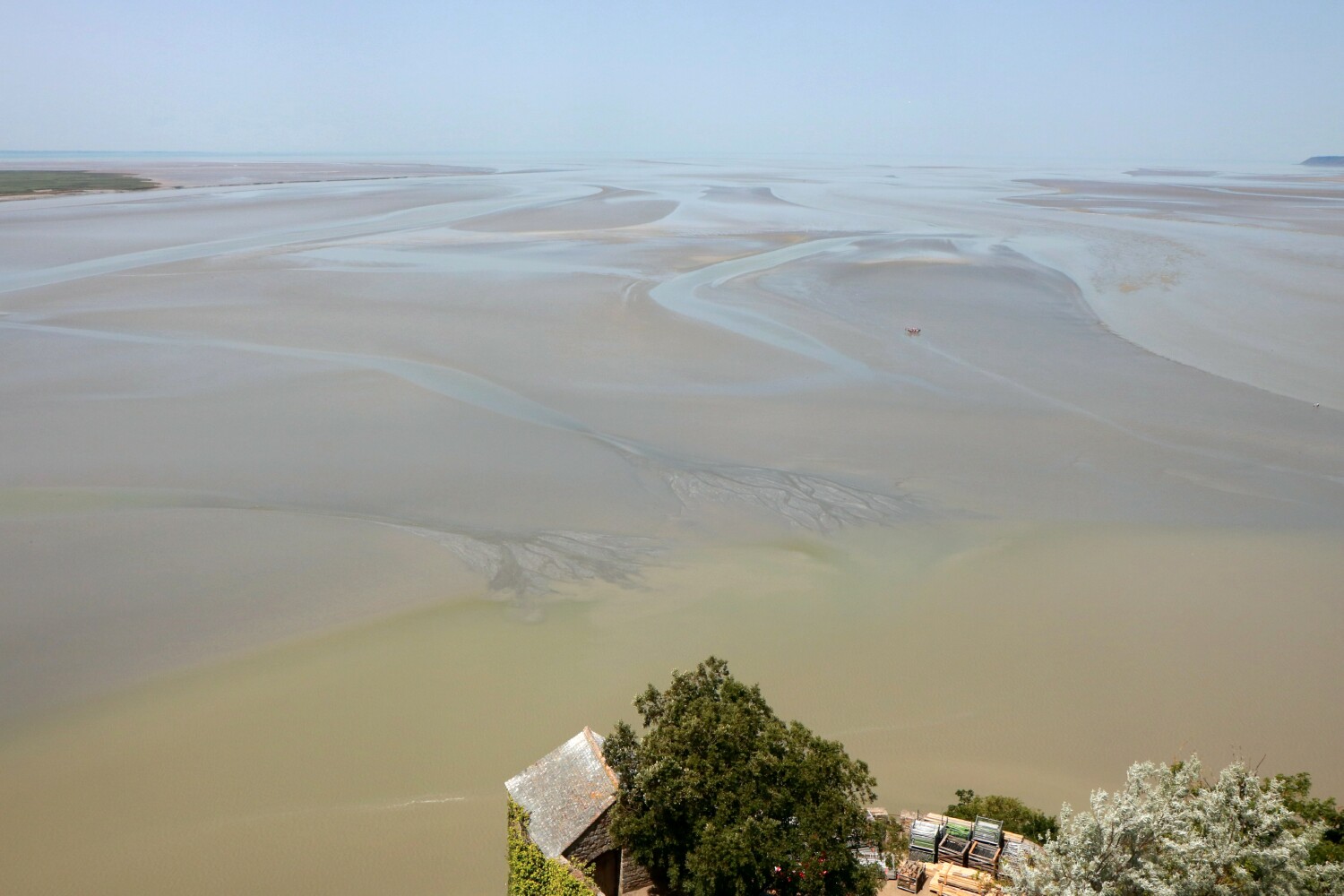 1, 2 and 7 views of the bay to the north to the Atlantic Ocean from the western terrace outside the Mont-Saint-Michel Abbey Church.