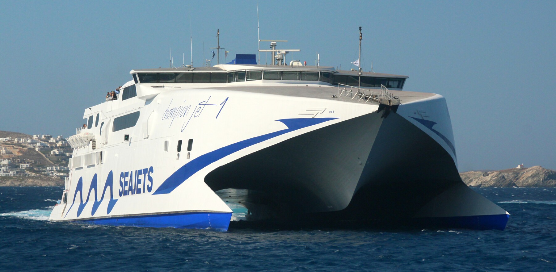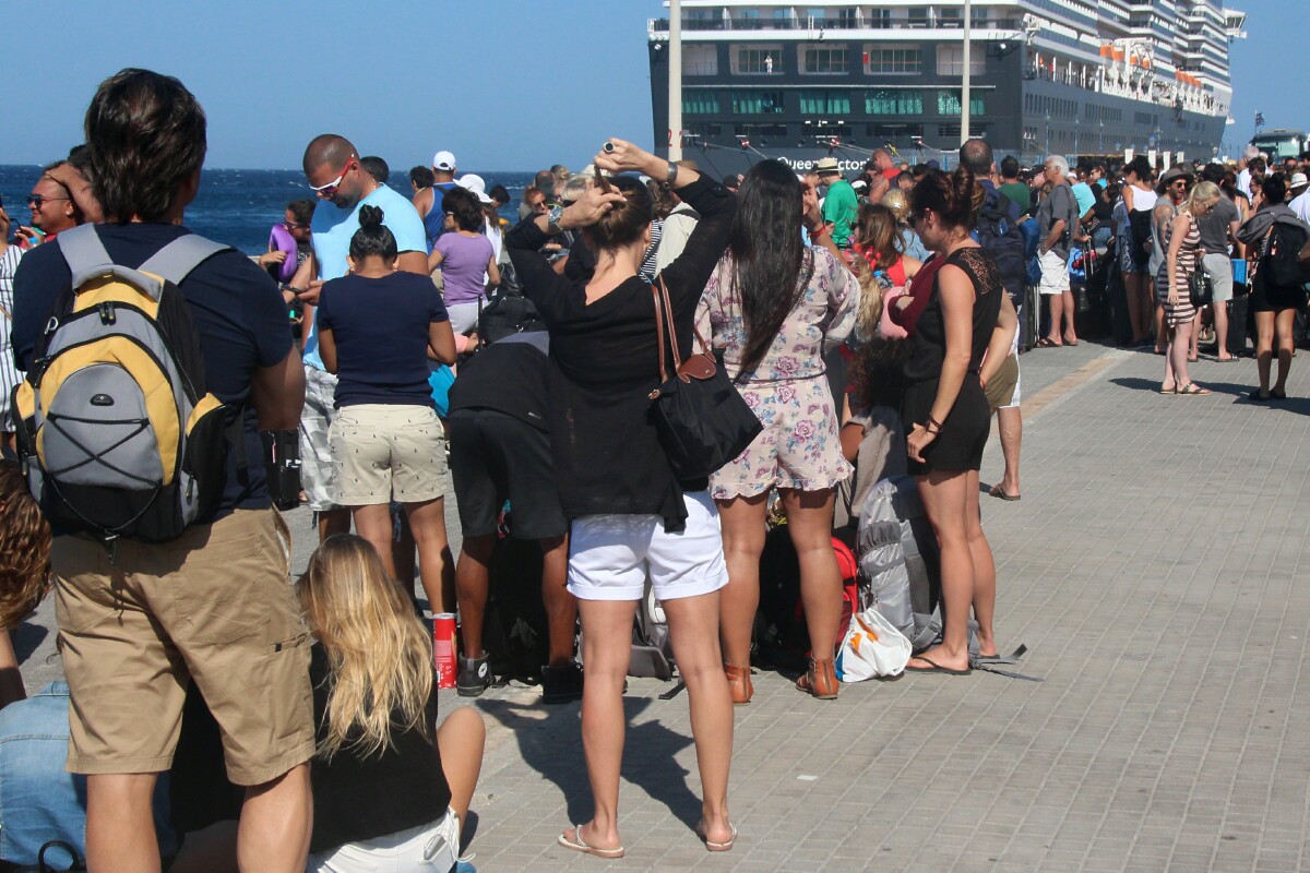 1 and 2 show the long line to get onto the Sea Jet for Santorini.