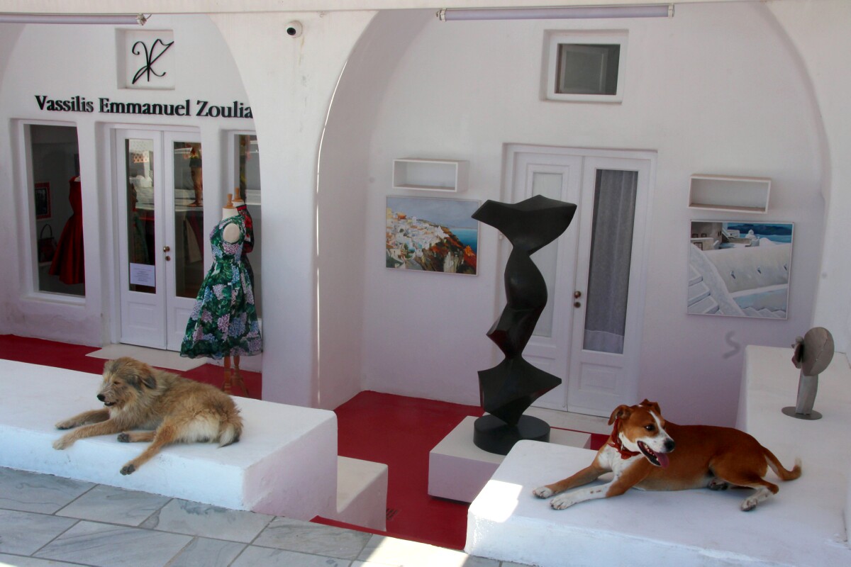 1 shows two dogs relaxing/standing guard over their stores.